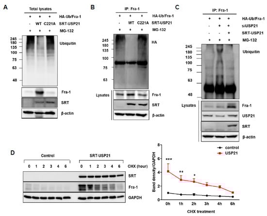 To investigate whether the catalytic activity of USP21 affects Fra-1 stability, a plasmid construct encoding mutant USP21 (C221A) that lacked catalytic activity due to a Cys-to-Ala substitution at 221 was constructed. Next, to determine whether USP21 facilitates deubiquitination of Fra-1 through its enzymatic activity, we examined the extent of ubiquitination (Ub) in total cell lysates (Figure 3A) and Fra-1-immunoprecipitation (IP) samples (Figure 3B) from 293T cells transfected with plasmids encoding wild type (WT) or mutant (C221A) USP21. Overexpression of WT USP21 resulted in the reduction of ubiquitinated proteins in the total cell lysate (Figure 3A) and complete removal of Ub from Fra-1 (Figure 3B). However, overexpression of C221A USP21 did not change ubiquitination levels (Figure 3A,B). Consistent with this observation, reduction in USP21 expression by siRNA promoted ubiquitination of Fra-1, which was reversed by the addition of WT USP21 (Figure 3C). These results demonstrate that Fra-1 is a substrate of USP21, and that its stability is controlled by ubiquitination. Consistently, USP21 overexpression in HCT116 cells clearly increases the half-life of Fra-1 protein in the presence of cycloheximide (CHX) (Figure 3D). Based on this result, this study confirmed that USP21 is required for protein stability of Fra-1 in colon cancer cells. Therefore, this study suggests that USP21 is a DUB of Fra-1.