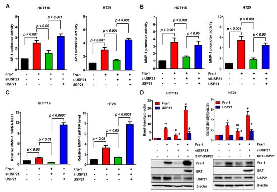 USP21 regulates Fra-1 activities. (A,B) HCT116 and HT-29 cells were transfected with scrambled siRNA (control) or siUSP21 for 24 h and then co-transfected with plasmids encoding Fra-1 or SRT-USP21 as indicated. After introducing AP-1 (A) or MMP-1 reporter plasmid (B) for an additional 24 h, luciferase transcriptional responses were measured in each cell line. Data were statistically analyzed by one-way ANOVA (n = 3). (C) After transfection with indicated plasmids into HCT116 and HT-29 cells, MMP-1 mRNA expression was quantified by real time-PCR with normalization to GAPDH. Values are fold-increases relative to the control, and error bars represent mean ± SD. Data were statistically analyzed by one-way ANOVA (n = 4). (D) HCT116 and HT-29 cells were transfected with scrambled siRNA (control) or siUSP21 for 24 h and subsequently co-transfected with plasmids encoding Fra-1 or SRT-USP21. Total cell lysates were analyzed by immunoblot analysis with the indicated antibodies. Quantification of band intensities was also shown by graph (n = 3–4). ** p < 0.01 vs. control, ## p < 0.01 vs. Fra-1, and # p < 0.05 vs. Fra-1.