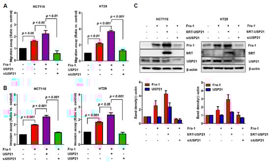 The expression level of Fra-1 in colon cancer is strongly correlated with cell migration and invasion []. We therefore evaluated the effect of USP21 on both migration (Figure 5A) and invasion activities (Figure 5B) in colon cancer cells, HCT116 and HT29. First, we verified that Fra-1 expression enhanced migration activity (Figure 5A). Then, we compared the migration activity of Fra-1 to that of co-overexpressing Fra-1 with USP21 or siUSP21. We found that USP21 significantly increased the migration activity of cancer cells, and USP21-knockdown reversely reduced cell migration. Consistently, the invasion activity of cancer cells was significantly induced by USP21, while USP21 knockdown reduced the Fra-1 effect (Figure 5B). It was also confirmed that the Fra-1 level was also proportional to the migration and invasion activity (Figure 5C). These results confirmed that USP21 is associated with the invasion and migration of colon cancer cells by controlling Fra-1 activity.