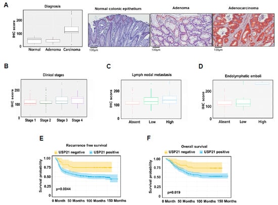 USP21 expression is highly correlated with cancer progression in colon cancer patients. (A,B) The expression of USP21 protein following the Oncotype DX assay (A, left) and according to tumor stage in CRC patients (B). Data were statistically analyzed by SPSS (version 18.0). Representative IHC images of USP21 expression in CRC patient samples (A, right). (C,D) Correlation of USP21 expression with nodal metastasis of CRC (C) and with endolymphatic emboli of CRC (D). Chi-squared tests (Pearson’s Chi-squared test or Chi-squared test using linear by linear association) were used to analyze correlations between IHC results and clinicopathologic parameters. (E,F) Kaplan–Meier survival curves of CRC patients: recurrence-free survival (E) and overall survival (F). Kaplan–Meier survival curves were drawn using the survival probability of CRC patients in all stages.