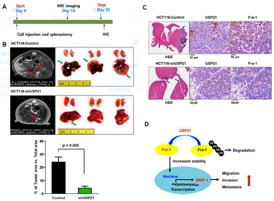 USP21 knockdown in colon cancer decreases in vivo metastasis. (A) The scheme of designed animal experiments. (B) Representative magnetic resonance images (MRIs) of tumors from HCT116-control and HCT116-USP21 knockdown groups at day 14 after intrasplenic injection (left). Developed tumors are marked by red arrows. Representative morphology of tumor formation in mouse liver driven by both HCT116-control and HCT116-USP21 knockdown at day 23 after intrasplenic injection (right). Tumor regions are indicated by green arrows. The extent of tumor formation was quantified as percentage ratio (%) of tumor-forming area to total area of the liver. Data were statically analyzed by t-test (HCT116-control, n = 6 and HCT116-shUSP21, n = 4). (C) Before applying the primary antibody, metastatic tumors in the livers of mice in HCT116-control and HCT116-USP21 knockdown groups was stained with hematoxylin and eosin (H&E). Black arrows show tumors, and blue rectangles indicate the region of immunohistochemistry from a representative tumor sample. Positive expression of USP21 and Fra-1 was detected (scale bar = 50 μm). (D) A schematic model for the role of USP21 in colorectal cancer metastasis. USP21 deubiquitinates Fra-1 to increase transcription of MMP-1, an Fra-1 target gene, and promotes cell motility and metastasis.