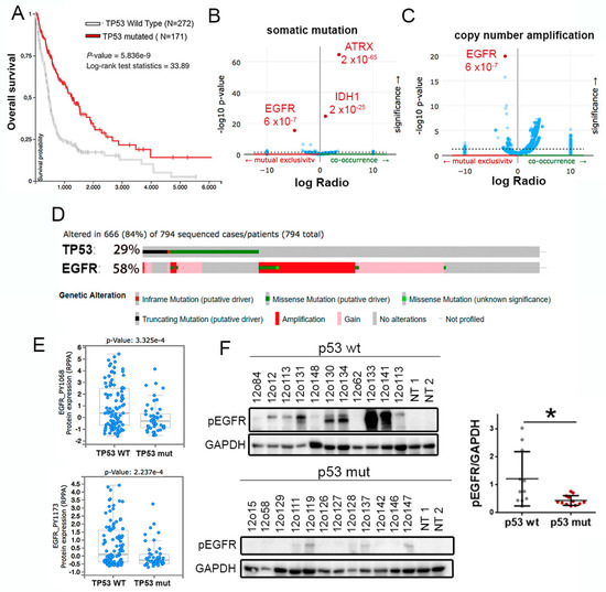 Opposite distribution of TP53 and EGFR alterations in gliomas. (A) Kaplan–Meier overall survival curves of patients from the TCGA LGG + GBM cohort. Patients were separated on the basis of the status of TP53. (B,C) Volcano plots showing mutated genes. (B) or copy number amplified genes (C) with differential distribution in gliomas, comparing TP53 wild-type and TP53 mutated tumors. (D) Distribution of somatic non-silent mutations in EGFR and TP53 in a glioma cohort (TCGA LGG + GBM dataset). (E) Analysis of levels of Phospho-Tyr1068-EGFR and Phospho-Tyr1173-EGFR in a cohort of patients with glioma (TCGA LGG + GBM dataset), according to the status of TP53. (F) Western blot (WB) analysis and quantification of Phospho-Tyr1068-EGFR (pEGFR) in tumor tissue extracts from patients diagnosed with glioma. Patients were separated based on the status of TP53. GAPDH protein levels were used as a loading control. NT: Normal Tissue. * p ≤ 0.05.