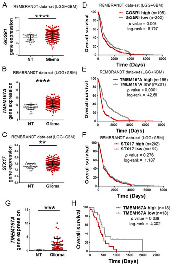 TMEM167A is overexpressed in gliomas and correlates inversely with tumor aggressiveness. Analysis of the amount of GOSR1 (A), TMEM167A (B), and STX17 (C) mRNAs levels in gliomas (LGG + GBM Rembrandt cohort) compared with normal tissue. (D–F) Kaplan–Meier overall survival curves of patients from the Rembrandt LGG + GBM cohort. Patients were separated on the basis of high and low GOSR1 (D), TMEM167A (E), and STX17 (F) gene expression values. (G) qRT-PCR analysis of TMEM167A in our own cohort of glioma samples (n = 52) compared with normal tissue. HPRT expression was used for normalization (H) Kaplan–Meier overall survival curves of patients from our own glioma cohort (n = 36). Patients in each cohort were stratified into 2 groups on the basis of high and low TMEM167A expression values. ** p ≤ 0.01, *** p ≤ 0.001, **** p ≤ 0.0001.