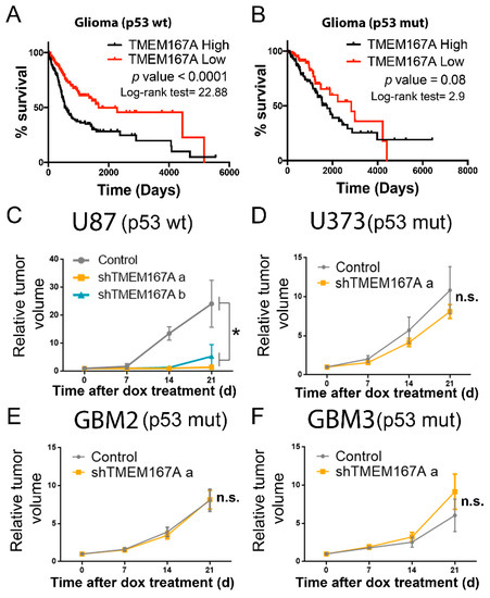 TMEM167A expression correlates with tumor aggressiveness in wild-type but not in mutant p53 gliomas. (A,B) Kaplan–Meier overall survival curves of patients from the Rembrandt LGG–GBM cohort. Patients were separated on the basis of the TP53 status: p53 wt (A) and p53 mut (B). Then they were stratified into two groups on the basis of TMEM167A expression values. (C–F) Subcutaneous tumor growth assay of U87 (C), U373 (D), GBM2 (E), and GBM3 (F) cells expressing shControl (Control) or shTMEM167A (shTMEM167Aa and shTMEM167Ab) (n = 6/group). The graphs were represented as fold increase in tumor volume. * p ≤ 0.05, n.s. = nonsignificant.