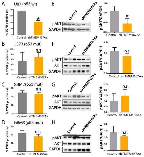 TMEM167A knockdown impairs EGFR stability and AKT signaling in wild-type p53 gliomas. (A–D) Flow cytometry analysis of the number of EGFR positive cells (%) in subcutaneous tumors from Figure 4C–F. (E–H) WB analysis and quantification of pSer473-AKT (pAKT) in tumors from Figure 4C–F. GADPH was used as a loading control. * p ≤ 0.05, n.s. = nonsignificant.