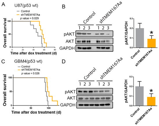 To get further insight into the function of TMEM167A in wild-type p53 GBMs, we performed intracranial injections of U87 cells expressing shControl (Control) or shTMEM167Aa (shTMEM167Aa) in the brain of nude mice (Figure S5A). We observed an increase in the survival of the mice that had been injected with shTMEM167A cells in comparison with the control-injected mice (Figure 5A). Moreover, TMEM167A knock-down (KD) induced a decrease in the amount of Phospho-AKT (Figure 5B), confirming our previous results [10] and demonstrating an efficient inhibition of EGFR signaling after the in vivo downregulation of TMEM167A. Even though this established cell line overexpresses EGFR, U87 cells do not carry alterations in this gene. To obtain an independent confirmation of the role of TMEM167A in wild-type p53 glioma cells, we inhibited its transcription in an EGFR amplified primary cell line (GBM4). Moreover, GBM4 cells express the N-terminal deleted vIII isoform (the most common EGFR mutation in GBM). The KD of TMEM167A in these cells (Figure S5B) also increased the survival of the injected mice (Figure 5C) and reduced AKT activation (Figure 5D). These results further support the relevance of TMEM167A function to maintain EGFR signaling in wild-type p53 gliomas and suggest that the antitumor effect of TMEM167A downregulation is independent on the presence of amplifications and/or mutations in the receptor’s gene.