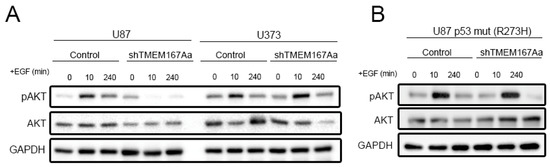 Overexpression of mutant p53 rescues the effect of shTMEM167A. (A,B) Growth factor-starved U87 and U373 cells (A) and U87 Tp53 mut (R273H) cells; (B) expressing shControl (Control) or shTMEM167Aa was stimulated with 100 ng/mL of EGF for the indicated times. The amount of pSer473-AKT (pAKT) was tested by WB. GAPDH was used as loading control.