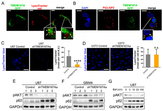 TMEM167A is required for vesicular acidification in wild-type p53 gliomas. (A) Representative images of GFP-TMEM167A and LysoTracker co-staining in 293T transfected cells. Arrows point toward colocalizing vesicles. (B) Representative images of GFP-TMEM167A and PI (3,4)P2 immunofluorescence (IF) co-staining in 293T transfected cells. Arrows point toward colocalizing vesicles. (C,D) Confocal images and quantification of LysoTracker staining in U87 (Control or shTMEM167Aa) cells (C) and U373 (Control or shTMEM167Aa) cells (D). (E,F) WB analysis of pSer473-AKT (pAKT) and p62 in tumors from Figure 3A (E) and Figure 3C (F). GADPH was used as a loading control. (G) WB analysis of pAKT and p62 in U87 cells treated with Bafilomycin A1 (Baf) at different concentrations. Scale bar: 10 μm (A,B), 75 μm (C,D) **** p < 0.0001, n.s. = nonsignificant.