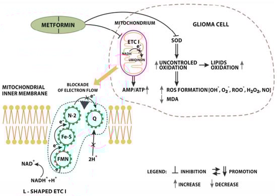 The ability of metformin to inhibit one of the ETC components, which is the electron transport chain complex I (ETCI), has been described. In the case of Owen et al., the experiments were conducted on an animal model [,]. ETCI is the largest component of ETC. Its role is to transfer electrons from the NADH matrix to ubiquinone []. ETCI inhibition results in a change in calcium ion levels and mitochondrial transmembrane potential levels. The AMP/ATP ratio is also disturbed, leading to an increase in oxidative stress, which affects cells [,,]