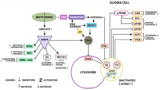 Metformin (MET) AMPK dependent signaling. An increase of AMP/ATP ratio activates AMPK/TSC2 signaling. TSC2 (Tuberous Sclerosis Complex 2) activation results in RHEB- mTORC 1 complex inhibition (Ras homologue enriched in the brain). Another signaling pathway causing mTORC 1 inhibition is stimulated by hypoxia and DNA damage as a result of MET + Temozolomide (TMZ) and radiation synergistic effect. Hypoxia also inhibits indirectly mTORC1 by PML (promielocitic leukemia protein) activation. The right side of the scheme presents the effects of mTORC1 inhibition in the glioma cell. Inactivated mTORC1 reduces p70S6K (Ribosomal protein S6 kinase) activity resulting in the decrease of CAD (trifunctional multi-domain: carbamoyl-phosphate synthetase 2, aspartate transcarbamylase, and dihydroorotase). Reduced CAD limits pirimidine synthesis in GBM cells. Collaterally, the reduction of p70S6K activity has a negative influence on EF2 (Elongation factor 2) andeIF4B (Eukaryotic translation initiation factor 4B) leading to limited protein synthesis. Contrary, the deactivation of mTORC1 promotes ULK-1(autophagy activating kinase) and TFEB (Transcription factor EB) proautophagic factors supporting new lysosomes formation. The left side of scheme presents AMPK’s direct effect on lipids and glucose metabolism in GBM. Concerning lipids, AMPK promotes ATGL (Adipose triglyceride lipase) activity resulting in fatty acids’ catabolism, and regulates ACC’s (Acetyl-CoA carboxylase) activity in fatty acids synthesis. Additionally, it reduces HMG-CoA’s (HMG-CoA reductase) activity resulting in the reduction of cholesterol synthesis. As far as glucose metabolism is concerned, AMPK inhibits glycogen formation limiting GS (glycogenesis), promoting TBC1D1 (TBC1 domain family member 1) and it increases glucose uptake and glycolysis. To sum up, AMPK inhibits mTOR and improves metabolic reprogramming, which consequently suppresses tumor growth.