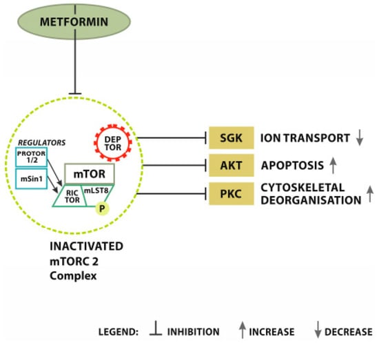 Metformin signaling-mTORC2 inhibition. MET inhibits mTORC2 directly. Inactivated complex limits further typical signaling. Transference restrictive signals from MET on mTORC2 result in the inhibition of SGK (serum and glucocorticoid-induced protein kinase), AKT (serine/threonine-protein kinase), and PKC (protein kinase C) related pathways. MET induced inactivation of mTORC2 results in SGK inhibition. SGK limitation significantly reduces ion transport. AKT inhibition consequently leads to apoptosis and PKC restriction accelerates cytoskeletal deorganisation.