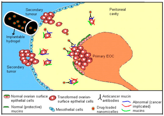 Illustration of the expression of cancer-associated mucins, accompanying the development of ovarian cancer and the intraperitoneal implant treatment, providing targeted therapy within the peritoneal cavity (Adapted with permission from [21].