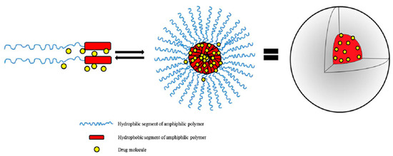 Nanomicelles are spontaneously self-assembled or aggregated as versatile nanoparticles formed in water at certain physicochemical parameters including concentration (above Critical Nanomicelle Concentration-CNC), temperature and conductivity; employing surfactants (hydrophilic–hydrophobic polymers), with opposite affinities towards a particular solution [55]. The assembly of amphiphilic components generates the structure or shape of nanomicelles. The copolymer sequence controls the configuration of the prepared nanomicelles. Thin rod designed nanomicelles are also generated when the water-insoluble component is greater than the water-soluble component. Sphere-shaped nanomicelles are usually indicative of a longer hydrophilic component with a minor hydrophobic component, or possibly a result of equal degrees of the amphiphilic components [56]. Constituents of the prepared supramolecular structure of polymeric micelles are usually di- or tri-segment/block, or a stable copolymer (Figure 3). Poly (ethylene oxide) (PEO) forms a barrier to nanomicelles, collapsing and displaying dissolution in an aqueous solvent [33,57]. The inner central component normally possesses a biodegradable polymer such as PEO/β-amino polyesters that can be utilised as an inner core to dissolve hydrophobic pharmaceutical drugs, thus shielding loaded constituents from the aqueous environment; increasing the bioavailability and in vivo efficacy [58,59,60].