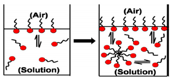 Schematic depiction of surfactant molecules aligning on water/air interface at pre- and post-‘Critical Nanomicelle Concentration (CNC)’ threshold (adapted with permission from Mukherjee et al. [68]).
