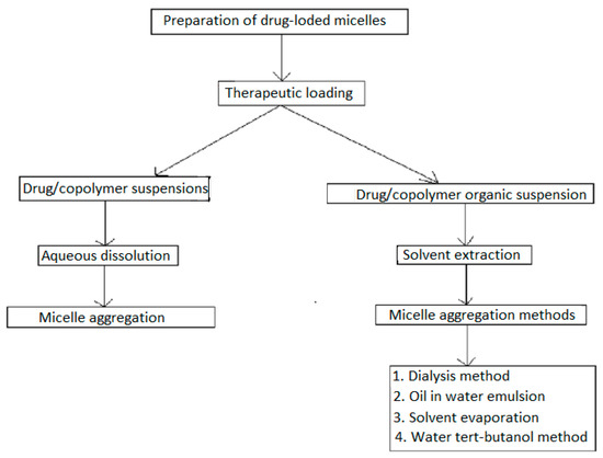 Preparation of therapeutic-loaded nanomicelles involves two major categories of therapeutic loading, reliant on the physicochemical properties of a block copolymer (Figure 5) [69]. The first category is the dissolution of co-polymer with a drug in a solution. This method is used in insoluble polymers, including Pluronics poloxamers, and necessitate the warming of the solution for nanomicelle aggregation, utilizing the dehydrated core profiling portion. This dissolution technique is also employed in preparation of PCCMs, with therapeutic polymer dissolved separately, and nanomicelle aggregates impelled by mixing of the two solutions to stabilize therapeutic–polymer ionic proportions [70,71]. The drawback of this technique is the low drug loading that occurs in nanomicelles [60,72].