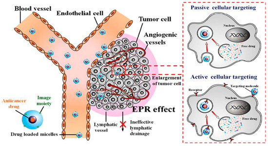 When nonfunctionalised nanomicelles have significant continual blood circulation period and successfully accumulate in tumour tissue through the passive enhanced permeability effect (EPR), this is indicative of passive targeting [76,108]. The therapeutic payloads are distributed to the tumour extracellular matrix and dispensed into the tumour cells and tissues. EPR targeting is ascribed to pathophysiological properties of tumours that are not identified in health tissue. These properties include the architecture of leaky tumour blood vasculature, impaired lymphatic drainage scheme, and increase in formation of permeability agents [109,110,111,112]. Several passive targeting nanocarrier systems have a PEG coating for stealth and “concealment” properties, including Genexol-PM, SP1049C, NK911, Opaxio™ (formerly Xyotax™), CRLX101, ProLindac™, SPI-77 and CPT-11 [76].