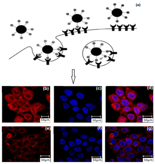 Schematic depiction of (a) active targeting, (b–g) confocal images of A431 cellular uptake incubated with cetuximab encapsulated micelles and lysotracker. The fluorescence intensity of A431 cells (b–d) treated with targeting micelles was 1.45 times higher than in cells incubated with antibody-free micelles (e–g) (Adapted with permission from Sudimack et al. [117]; Liao et al. [118].