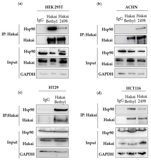 Hakai interacts with heat shock protein 90 (Hsp90): Co-immunoprecipitation of Hakai and Hsp90 was performed in different cell lines: (a) HEK293T. (b) ACHN. (c) HT29. (d) HCT116. Hakai immunoprecipitation was performed by employing two different rabbit polyclonal Hakai antibodies indicated in material an methods: one from Bethyl (Bethyl Ab) and one kindly provided by Dr. Fujita (Hakai-2498). GAPDH signal was used as protein loading control.