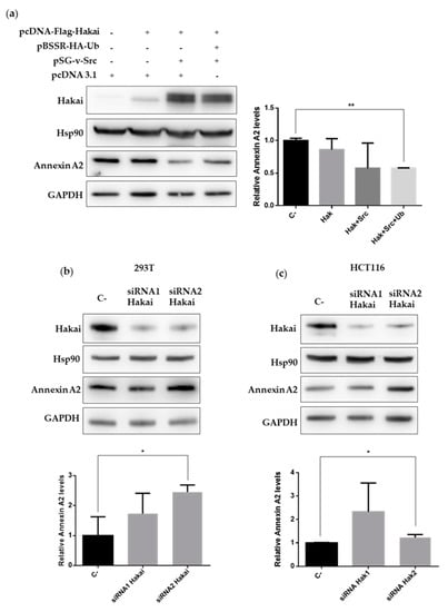 In order to understand the meaning of the interaction between Hakai, Annexin A2 and Hsp90, first, we decided to confirm the previous proteomic study on which Annexin A2 was downregulated in stably Hakai-overexpressing MDCK cells compared to normal cells [21]. On one hand, it is reported that Hakai interacts with Src tyrosine-phosphorylated substrates, an on the other hand, Annexin A2 is tyrosine-phosphorylated by Src kinase [12,27]. We carried out a transient transfection of Flag-Hakai together with Src and HA-ubiquitin in HEK293T cells to favor the activity of the ubiquitin-mediated degradation system. Besides, co-overexpression of Hakai with Src favors the increase of Hakai levels [12,16]. As expected, Annexin A2 protein expression was significantly reduced by Hakai overexpression, while Hsp90 protein expression was not affected (Figure 3a, Supplementary Figure S6). Moreover, silencing Hakai protein levels by transiently transfecting two different Hakai siRNAs statistically significant increased Annexin A2 expression in HEK293T (Figure 3b, Supplementary Figure S6) and in HCT116 cells (Figure 3c, Supplementary Figure S6), without affecting Hsp90 protein expression. Moreover, this upregulation of Annexin A2 in HEK293T cell line was accompanied with an increase protein levels of the best-described substrate for the E3 ubiquitin-ligase Hakai, E-cadherin [12,16]. These data suggest that Hakai may act as an E3 ubiquitin-ligase for Annexin A2 protein, inducing its degradation.