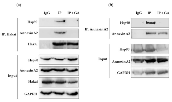 It is generally reported that chaperone-interacting E3 ubiquitin-ligases induce the degradation of the chaperone client proteins that have not been correctly folded [22,23,24]. Therefore, it is reasonable to assume that additional E3 ubiquitin-ligases are involved in the degradation of HSP90 clients. Given the interaction confirmed between Hakai and Hsp90, our findings led us to ask whether Hakai may also participate in the regulation of other Hsp90 client proteins. Annexin A2 was one of the proteins detected in a proteomic study that turned out to be downregulated in Hakai-overexpressing MDCK cells compared to non-transformed MDCK epithelial cells [21]. In addition, it has been reported that Annexin A2 co-immunoprecipitates with Hsp90 [25]. Annexin A2 is a calcium-binding protein reported to be implicated in membrane and vesicle trafficking [26]. Considering these premises, we further analyze the possible interaction between these three proteins. Endogenous interaction of Hsp90 with Hakai and Annexin A2 was confirmed in HCT116 cells. Immunoprecipitation of endogenous Hakai co-precipitated with endogenous Hsp90 (Figure 2a, Supplementary Figure S5). Endogenous Annexin A2 also co-precipitated with endogenous Hakai (Figure 2b, Supplementary Figure S5). Conversely, immunoprecipitation of Annexin A2 also co-precipitated with endogenous Hsp90 (Figure 2c, Supplementary Figure S5). These results confirm that Hakai, Hsp90 and Annexin A2 form an interacting protein complex, either mediated by a direct or indirect interaction.