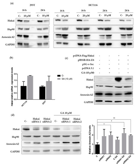Geldanamycin is probably the best described Hsp90 inhibitor so far and acts by blocking its ATP binding site, preventing the correct folding of the client proteins that, in consequence, often turns into the degradation through proteasome [28,29]. Given the previously detected interaction between Hsp90, Hakai, and Annexin A2, we decided to study whether geldanamycin may affect these protein interactions. As shown, the described interaction between Hakai, Hsp90 and Annexin A2 was completely disrupted in presence of geldanamycin when using Hakai or Annexin A2 antibodies for the immunoprecipitation assays (Figure 4, Supplementary Figure S7). Given that Annexin A2 is proposed as a potential new substrate for the E3 ubiquitin-ligase Hakai and that geldanamycin disrupts the interaction between Hakai and Hsp90, it is open the possibility that Hakai might be a direct client protein for Hsp90 chaperone. In order to test whether geldanamycin could downregulate Hakai, we used two different concentrations of geldanamycin Hsp90 inhibitor (10 µM and 20 µM) and we treat two different cell lines, HEK293T and HCT116 cells for 16 and 24 h. The cells were collected and subjected to western-blotting analysis. As shown, geldanamycin treatment decreases Hakai protein levels in both cell lines tested, while an increase of Annexin A2 was detected (Figure 5a, Supplementary Figure S8). Furthermore, we found that treatment with geldanamycin did not decrease Hakai mRNA levels supporting that Hsp90 inhibitor downregulates Hakai at the post-transcription level (Figure 5b, Supplementary Figure S8). Moreover, we tested the effect of Hsp90 inhibitor on the downregulation of Hakai by transiently transfecting Flag-Hakai together with v-Src, and HA-ubiquitin in HEK293T cells. Hakai levels were drastically reduced in presence of geldanamycin compared to non-treated control transfected conditions, accompanied by an increase of Annexin A2 protein levels (Figure 5c, Supplementary Figure S8). These data confirm that geldanamycin is able to downregulate both endogenous and ectopically expressed Hakai while it upregulates Annexin A2. Finally, the effect on Hakai and Annexin A2 protein levels was tested by combining geldanamycin treatment together with two different siRNA Hakai oligos. HCT116 cells were transiently transfected with the indicated siRNA Hakai oligos for 72 h and treated with 10 µM geldanamycin for 24 h. Reduction of Hakai expression levels was accentuated when combining geldanamycin treatment together with the previously tested siRNA Hakai oligos, leading to almost Hakai completely disappearance (Figure 5d, Supplementary Figure S8). On the contrary, Annexin A2 levels were significantly increased. Altogether, these data demonstrate that geldanamycin Hsp90 inhibitor induce Hakai protein downregulation via post-transcriptional mechanism and support that Annexin A2 is a new substrate for the E3 ubiquitin-ligase Hakai protein.