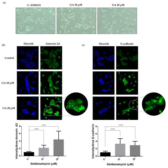 As previously mentioned, Hakai is an E3 ubiquitin-ligase for E-cadherin that plays a role on the epithelial–mesenchymal transition program. Given the effect of geldanamycin on Hakai expression, we also analyzed the effect of geldanamycin on the cell phenotype. HCT116 epithelial cells were treated for 24 h with geldanamycin with the indicated concentrations showing a more epithelial phenotype under the treatment. Indeed, HCT116 loses the mesenchymal phenotype accompanied by decreasing cellular protrusions (Figure 6a). Moreover, we also analyzed the localization of Annexin A2 and E-cadherin by immunofluorescence. Annexin A2 expression was increased in presence of the geldanamycin showing a statistically enriched pattern in cytoplasm and cell membrane (Figure 6b).