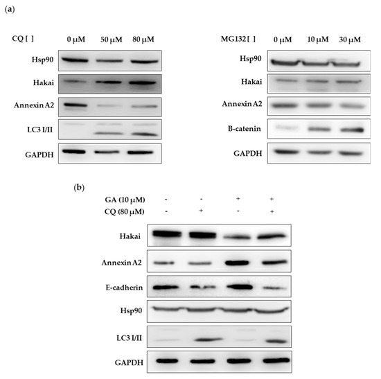 Then, we further investigated the possible mechanism of Hakai degradation under geldanamycin treatment. First, we analyzed the effect on Hakai protein expression of proteasome inhibitor MG132 and the lysosome inhibitor chloroquine (CQ). As shown, Hakai protein expression was increased in presence of chloroquine while no effect was observed in presence of MG132 (Figure 7a, Supplementary Figure S9), further indicating that Hakai may be degraded in a lysosome-dependent manner. Besides, Hakai levels increase was accompanied by a downregulation of Annexin A2, supporting the previously obtained results that suggest that Annexin A2 is as a new possible target protein for Hakai E3 ubiquitin-ligase. Next, we analyzed the mechanism by which Hakai is degraded in absence of Hsp90 function. In order to better detect Hakai downregulation under geldanamycin treatment, HEK293T cells were transiently transfected with Hakai, Src and Ubiquitin for 48 h and treated in presence or absence of geldanamycin and chloroquine for 24 h and protein lysates were analyzed by western blot. As shown, chloroquine lysosome inhibitor efficiently prevented Hakai degradation induced by geldanamycin (Figure 7b, Supplementary Figure S9). Accordingly, Annexin A2 was upregulated under geldanamycin treatment while this effect was reverted in combination with chloroquine inhibitor. Moreover, the well-described substrate for the E3 ubiquitin-ligase Hakai, E-cadherin, was also regulated in a similar manner than Annexin A2. All these data support that Hsp90 inhibitor geldanamycin induces downregulation of its client protein Hakai in a lysosome-dependent manner. Moreover, Hakai substrate E-cadherin was also regulated in a similar manner than Annexin A2. All these data support that Hsp90 inhibitor geldanamycin induces downregulation of its client protein Hakai in a lysosome-dependent manner. Moreover, E-cadherin and Annexin A2, were also affected by geldanamycin treatment, suggesting the involvement of Hsp90 chaperone in the regulation of Hakai specific substrates.