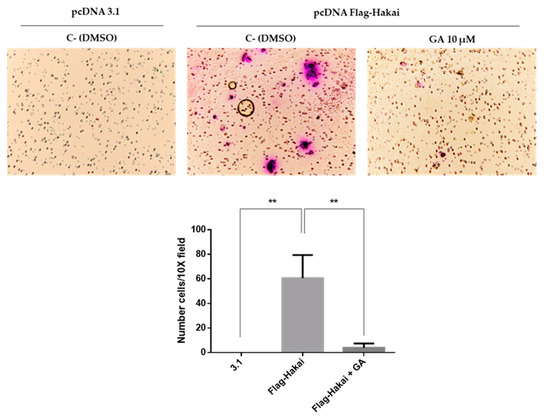 HSP90 is required for the stability and function of numerous oncogenic proteins, and its specific inhibitors display multiple anticancer effects [30,31,32]. On the other hand, Hakai is considered an oncogenic protein that was reported to be overexpressed in various cancers such as colon and lung cancer [16,19,20], furthermore, Hakai knockdown inhibits cell migration [33]. Therefore, we decided to test whether Hsp90 geldanamycin inhibitor may indeed influence the migratory effect driven by Hakai. Transwell migration assay was performed in HEK293T by transiently transfected with pcDNA 3.1 or pcDNA-Flag-Hakai. HEK293T cells transfected with pcDNA-Flag-Hakai would strongly increase cell migration compared to cells transfected with an empty vector (Figure 8). This migratory capability induced by Hakai overexpression was drastically reduced in presence of geldanamycin. herefore, our results support that geldanamycin treatment affects Hakai-mediated cell migration by reducing Hsp90 activity and consequently affecting Hakai-induced migration capacity.