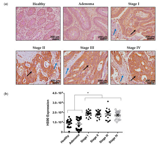 Hsp90 expression levels in colorectal cancer human samples: (a) Representative images of Hsp90 immunoreactivity in normal colonic mucosa, adenoma and colorectal cancer (TNM stages I–IV). Images were obtained with 20× objective. Scale bar 125 µm. (b) Statistical quantification of Hsp90 staining intensity in epithelial cancer cells at different colon cancer stages and in adenoma and normal colon tissue. A total of 30 human colon samples were analysed including: different TNM stages (I–IV) from colon adenocarcinomas, colon adenoma compared to human colon healthy tissues (normal colonic mucosa, n = 5; adenoma, n = 5; colorectal cancer, n = 5 of all stages) Scale bar, 200 µm. Black arrows show tumoral tissue and blue arrows show stromal tissue. Five photographs of each tissue were quantified and data are represented as scatter plot. Results are represented as Mean ± SEM for signal intensity scoring per area. Analysis was performed by employing Kruskal-Wallis with Tukey correction test (* p < 0.05).