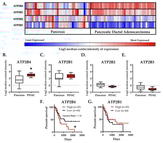 Elevated PMCA4 mRNA expression (ATP2B4) in PDAC is correlated with low patient survival. (A–E) Badea Pancreas (2008) gene chip microarray data, comparing resected PDAC tumor and healthy pancreatic tissue obtained from matched tumor margin (n = 39), was obtained from Oncomine open-source database. (A) Heat map of ATP2B1–4 gene expression in healthy pancreatic tissue and PDAC tumor (n = 39). Heat map colors, ranging from least expressed (blue) to most-expressed (red), depicts relative Log2 median-centered intensity within rows. Heat map colors cannot be compared between rows. Gene expression based on the Log2 median-centered intensity of (B) ATP2B4, (C) ATP2B1, (D) ATP2B2 and (E) ATP2B3 are individually presented as box and whisker plots. The whiskers indicate 10–90 percentile of the data range. Statistical comparison between PDAC and healthy pancreas tissue were analyzed using Wilcoxon matched-pairs sign rank test. (F,G) PDAC patient survival data were sourced from TCGA-PAAD (n = 176), through The Human Protein Atlas database (January 2019, www.proteinatlas.org). The cohort of 176 PDAC patients was divided into quartiles based on the median-centered gene expression (fragments per kilobase of transcript per million mapped reads; FPKM) into either low (25 percentile) and high (75 percentile) gene expression. Kaplan–Meier survival curves correlating the survival of PDAC patients to the low (black) or high (red) expression of (F) ATP2B4 and (G) ATP2B1. The entire survival outcome curve of the high and low ATP2B4 expressions were used for statistical analysis; the survival outcomes of each group were compared using a log-rank test (Mantel-Cox test). * represents statistical significance where p < 0.05.