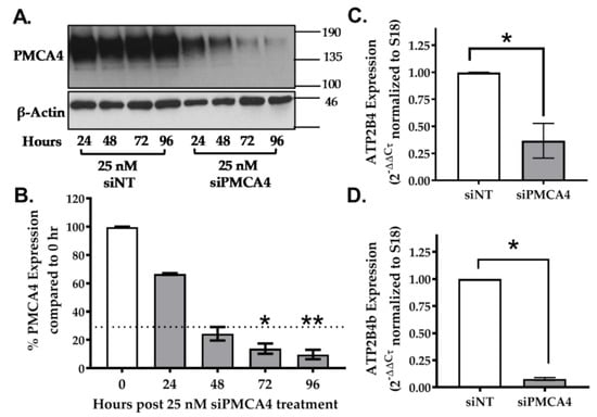 Using Western immunoblotting, results show that PMCA4 protein expression decreased in a time-dependent manner in comparison to the siNT control. PMCA4 expression decreased by at least 70% between 48–96 h post-siPMCA4 treatment (Figure 3A,B, n = 3, p < 0.05). At mRNA level, the total ATP2B4 and splice variant ATP2B4b expressions were knocked down by at least 70% after 48 h (Figure 3C,D, n = 4, p < 0.05). Moreover, there were no compensatory changes in ATP2B1–3 expression (Figure S1). According to the study by Curry et al., conditions yielding ≥70% PMCA mRNA expression knockdown were sufficient to functionally modulate Ca2+ signaling in MDA-MB-231 breast cancer cells [14]. Therefore, siRNA incubations between 48–96 h, yielding ≥70% PMCA4 mRNA expression knockdown, were used for further experiments.