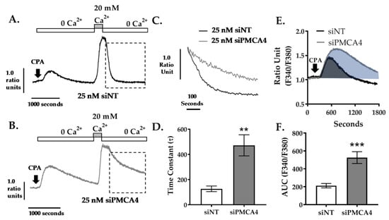We found that knocking down PMCA4 led to profound inhibition of [Ca2+]i clearance compared to siNT control (Figure 4A,B). In siPMCA4-treated cells, the mean τ was significantly higher (τ = 472 ± 84.0 s, p = 0.0091) when compared to siNT controls (τ = 126.8 ± 22.4 s), suggesting Ca2+ clearance rate was significantly reduced as expected (Figure 4C,D). In addition, the transient increase in [Ca2+]i following addition of CPA, in zero external Ca2+, reflects ER Ca2+ leak that is cleared from the cytosol by the PMCA. This was also significantly greater in PMCA4 siRNA-treated cells (area under the curve (AUC) = 525.8 ± 65.9, p < 0.001) compared to siNT controls (AUC = 211.6 ± 24.8; Figure 4E,F). These results suggest that PMCA4 expression is required for Ca2+ efflux and the loss of PMCA4 significantly impairs Ca2+ clearance.