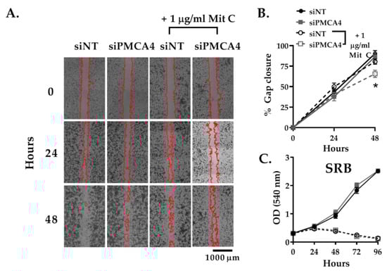 Without Mit C treatment, gap closure attributed to both cell migration and proliferation was relatively similar between siPMCA4 and siNT control (Figure 5A,B). Furthermore, no differences between the growth rate of siPMCA4 and siNT control were observed from SRB assays (Figure 5C). Upon treatment with Mit C, to selectively monitor cell migration, siPMCA4-treated cells exhibited reduced gap closure (65.6 ± 4.4 % closure, p < 0.05) compared to siNT controls after 48 h (80.6 ± 3.2% closure; Figure 5A,B). Mit C treatment inhibited cell growth of both siNT and siPMCA4 at 48 h without any noticeable effect on cell viability. However, at 72 h SRB absorbance had declined, suggesting that Mit C was affecting cell viability beyond 48 h. Nevertheless, this suggests that any changes in gap closure in Mit C-treated cells over 48 h represent an effect on cell migration, independent of cell viability or cell proliferation. Overall, our results showed that PMCA4 knockdown significantly inhibited cell migration but had no effect on the growth rate of MIA PaCa-2 cells.