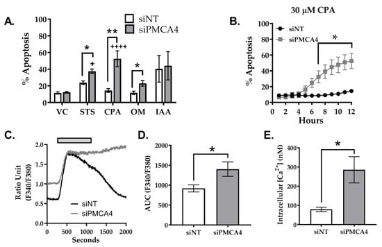 Over a period of 12 h, we found that STS significantly induced caspase 3/7 cleavage in both siNT (23.9 ± 2.1%) and siPMCA4 (37.5 ± 2.7%) compared to DMSO vehicle control (11.5 ± 1.38%; Figure 6A; Figure S2). Our results showed that PMCA4 knockdown cells were significantly more susceptible to STS, CPA, and OM induced apoptosis compared to siNT control. PMCA4 knockdown cells were noticeably sensitized to CPA-induced cell death (52.5 ± 9.5% at 12 h) and significant caspase 3/7 cleavage was observed from as little as 7 h (32.4 ± 7.6% at 7 h; Figure 6A,B). Although CPA is suggested to induce ER stress associated cell death [45], CPA-induced significant apoptosis in siPMCA4 but had no effect on siNT control. Conversely, IAA caused similar levels of apoptosis in both siPMCA4 (40.5 ± 16.0%) and control (44.1 ± 16.9%; Figure 6A). Overall, in comparison to vehicle control, CPA and OM had no effect on siNT control but significantly increased apoptosis in PMCA4 knockdown cells, suggesting that PMCA4 expression knockdown sensitized MIA-PaCa2 PDAC cells to Ca2+ and mitochondrial stress.