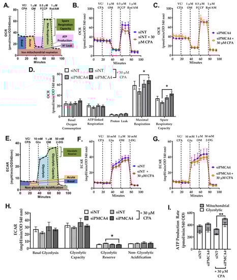 Cells seeded were incubated for 48 h in either siNT or siPMCA4. Seahorse cartridges were hydrated according to manufacturer instructions. Low phenol-red DMEM, pH 7.4 media was used for all Seahorse-based assays. Either vehicle control (<0.1% DMSO) or 30 µM CPA were pre-injected in addition to the sequentially designated reagents for the mito stress (e.g., 1.5 μM oligomycin, 0.5 μM FCCP, and 0.5 μM rotenone and antimycin) and glycolysis stress test (e.g., 10 mM glucose, 1 μM OM, and 50 mM 2-deoxyglucose). Seahorse data obtained were analyzed using Wave analysis software (Agilent Technologies, Santa Clara, CA, USA). Seahorse XF real-time ATP rate equations were used to convert basal and oligomycin treated OCR and ECAR measurements (derived from mito stress test; Method S5) into mitochondrial and glycolytic ATP production rates [48].