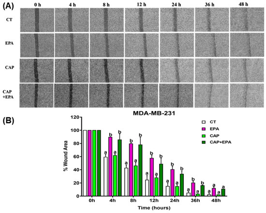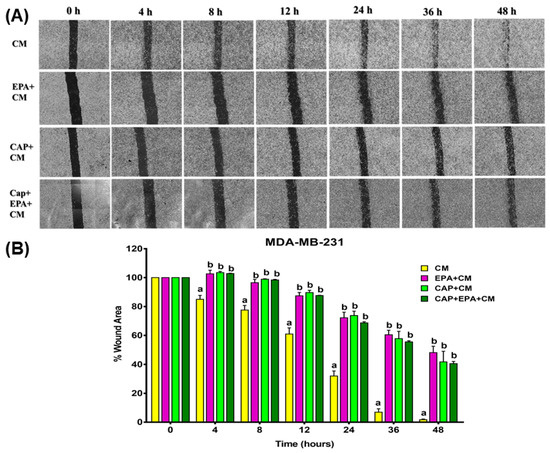 2.2. Combined Effect of Captopril and EPA on Breast Cancer Cell Migration in Response to Treatment with Adipocyte CM, Measured by a Wound Healing Assay
