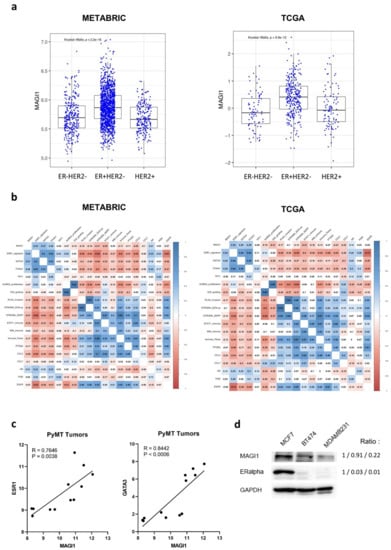 Membrane-associated guanylate kinase with inverted domain structure-1 (MAGI1) expression correlates with estrogen receptor breast cancer (ER+ BC) subtype. (a) MAGI1 expression from METABRIC and TCGA microarray analysis by BC subtype ER−/HER2−, ER+/HER2−, and HER2+. Statistical analysis was performed by Kruskal–Wallis test (non-parametric one-way ANOVA). (b) Heat plot correlation matrices in ER+HER2− patients from METABRIC and TCGA data. Significant correlations are in blue, anti-correlations are in red. (c) MAGI1 mRNA levels positively correlates with ESR1 and GATA3 expression in MMTV-PyMT tumor samples. The data from qPCR are shown as a percentage of Arbp1. Correlation analysis was calculated with Pearson’s R correlation test (n = 12 tumors). (d) Western blot showing MAGI1 and ERα protein levels in MCF7 (ER+/HER2−), BT474 (HER2+), and MDA-MB-231 (basal-like, ER−/HER2−) cell lines. GAPDH is used as loading control. Band intensity ratio adjusted to GAPDH is shown next to the blot.