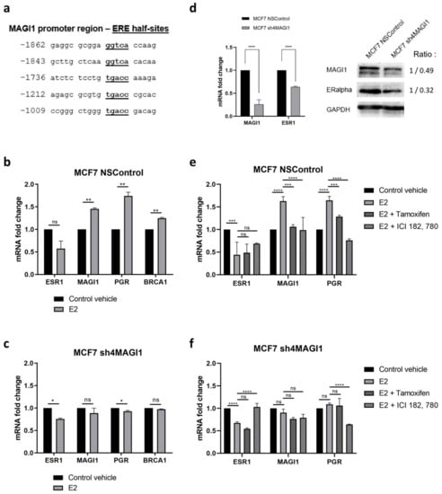 To investigate whether MAGI1 may be regulated by estrogen and ERα, we first analyzed bioinformatically the MAGI1 promoter sequence and noticed that it contains five different putative estrogen response elements (EREs) half-sites at positions −1009/−1013 (Site I), −1212/−1216 (Site II), −1736/−1740 (Site III); −1843/−1847 (Site IV) and −1862/−1866 (Site V) (Figure 2a). To functionally test whether MAGI1 mRNA expression is indeed regulated by estrogen, MCF7 cells were serum-starved for 48 h and subsequently treated for 6 h with 10−6 M 17β-estradiol (E2) or vehicle only. As shown in Figure 2b, MAGI1 mRNA levels were up-regulated upon E2 treatment together with progesterone receptor (PGR) and BRCA1, two known estrogen regulated genes [36]. ESR1 expression, which is known to be negatively regulated by E2 itself [37], showed a trend toward reduced expression but the difference was not significant. Next, we tested whether MAGI1 itself functionally contributed to E2/ER signaling. MAGI1 downregulation in MCF7 cells prevented induction of PGR and BRCA1 expression in response to E2 stimulation (Figure 2c). MAGI1 downregulation in MCF7 cells decreased ESR1 mRNA and ERα protein levels (Figure 2d). To gather additional evidence that these effects were E2/ER specific, we stimulated MCF7 control cells (NSControl) and MCF7 cells with downregulated MAGI1 (sh4MAGI1), with E2 in the presence of the ER antagonist tamoxifen and ICI 182,780, and measured expression of MAGI1, ESR1 and PGR by RT-qPCR. Results show that tamoxifen and ICI 182,780 blunted the effects of E2 stimulation on MAGI1, ESR1 and PGR expression (Figure 2e,f). Taken together these data suggests the involvement of MAGI1 on ER signaling.