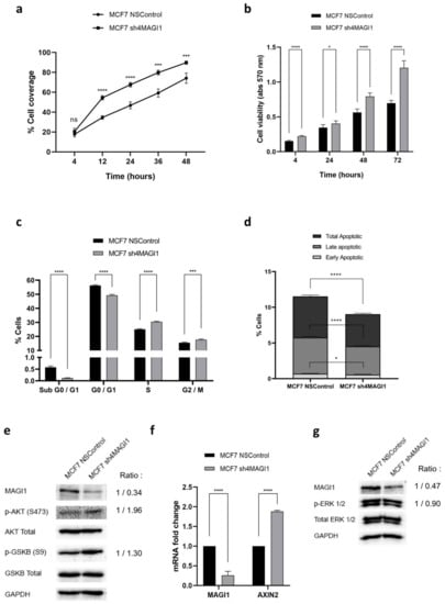 MAGI1 downregulation increases proliferation, reduces apoptosis and activates PI3K/Wnt signaling in MCF7 cells. (a) Growth of MCF7 NSControl and MCF7 sh4MAGI1 cells measured as percentage of cell culture well coverage by the IncuCyte system at the indicated time points (hours) after plating (n = 18 independent experiments). (b) Cell viability of MCF7 NSControl and MCF7 sh4MAGI1 cells measured by MTT assay and the indicated time points (hours) after plating (n = 6 independent experiments). (c) Quantification of the percentage of MCF7 cells in the sub G0/G1, G0/G1, S and G2/M phases of the cell cycle by Edu/DAPI staining (n = 3 independent experiments). (d) Quantification of the percentage of early, late and total apoptotic MCF7 cells by DAPI/Annexin-V staining and analysis. The data represents mean values ± S.D. (n = 3 independent experiments). (e) Effect of MAGI1 silencing (sh4MAGI1) on S473AKT and S9GSKβ3 phosphorylation relative to control (NSControl) in MCF7 cells revealed by western blotting analysis. (f) Effect of MAGI1 silencing (sh4MAGI1) relative to control (NSControl) MCF7 cells on AXIN2 expression. The data are shown as percentage of the value of the housekeeping gene GAPDH, and represent mean values ± S.D. (n = 3 independent experiments, each analyzed in triplicate). (g) Effect of MAGI1 silencing (sh4MAGI1) on ERK phosphorylation relative to control (NSControl) in MCF7 cells revealed by western blotting analysis. GAPDH is used as loading control. Band intensity ratio adjusted to GAPDH is shown next to the blot. Statistical analyses were performed by unpaired t-test. ns = no statistical difference, * p < 0.05, *** p < 0.005, **** p < 0.001.