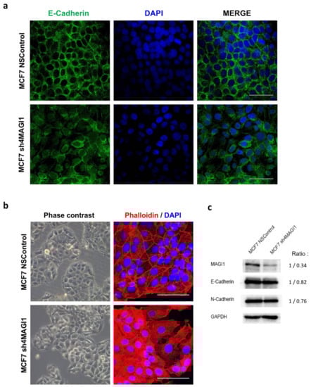 MAGI1 downregulation in the BC cell line MCF7 leads to loss of E-cadherin localization at cellular junctions (Figure 4a). In sub-confluent cultures, MCF7 typically forms regular islands of cohesive, polygonal epithelial cells. MAGI1 downregulation altered this phenotype and induced irregular islands with elongated or rounded cells and rearranged actin fibers from subcortical to cytoplasmic localization (Figure 4b). However, MAGI1 downregulation did not induce global reduction of E-cadherin nor increase of N-cadherin expression (Figure 4c), indicating that MAGI1 downregulation does not cause epithelial-to-mesenchymal transition but rather a loss of epithelial differentiation traits.