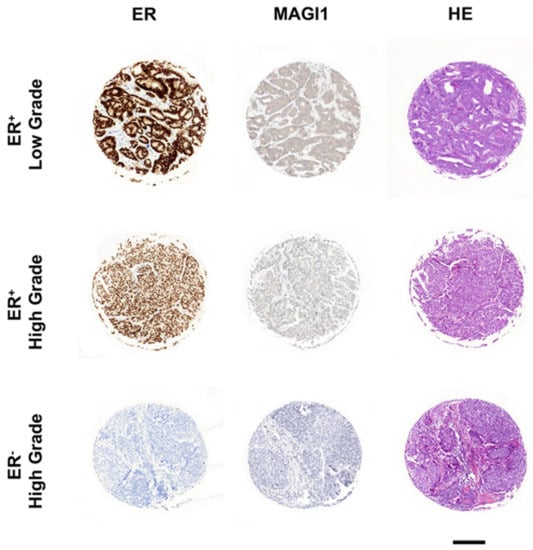Immunohistochemical analysis of ER and MAGI1 expression in human breast cancers. MAGI1 expression is well expressed in low grade (well differentiated) ER+ tumors, expressed in lower level in high grade (poorly differentiated) ER+ tumors and absent in ER− tumors. Differentiation (grading) was determined by HE staining. Scale bar corresponds to 200 µm.