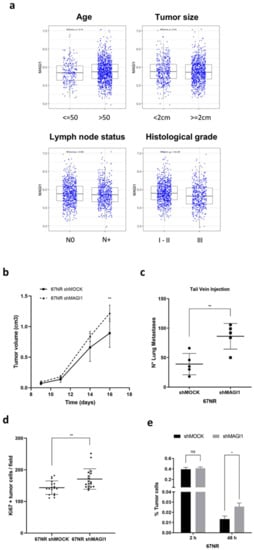 MAGI1 downregulation promotes metastatic progression of ER+ cancers. (a) MAGI1 expression in ER+/HER2− patients from METABRIC microarray analysis by age (≤50 vs. >50), tumor size (<2 cm vs. ≥2 cm), lymph node status (N0 vs. N+) and histological grade (III vs. I–II). Statistical analysis was performed by Kruskal–Wallis test (non-parametric one-way ANOVA). (b) MAGI1 silencing enhances growth of primary tumors derived from 67NR cells. Data represent mean values ± S.D (n = 7 mice). (c) MAGI1 silencing enhance lung metastatic nodules number in BALB/c mice injected via tail vein with 67NR (shMOCK and shMAGI1) cells. Data represent mean values ± S.D. (n = 5 mice). (d) Quantification of Ki67 staining of lung metastatic nodules of BALB/c mice injected via tail vein with 67NR (shMOCK and shMAGI1) cells. Ki67 positive cells were counted per high-power field (63× objective). The data represents mean ± S.D. (n = 18 fields per condition). (e) Quantification of tumor cells present within the lungs 2 h (2h) or 48 h (48h) after tail vein injection of 67NR (shMOCK and shMAGI1) cells. (n = 3 mice). Statistical analyses were performed by unpaired t-test. ns = no statistical difference, * p < 0.05, ** p < 0.01.
