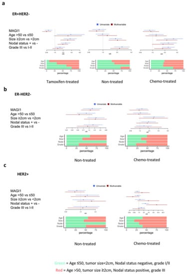 Low MAGI1 expression predicts poor prognosis in ER+ breast cancer. (a–c) Forest plots showing correlation of MAGI1high, age, tumor size, nodal status and grade with risk of relapse (hazard ratio, HR) in (a) ER+/HER2−, (b) ER−HER2−, and (c) HER2+ BC patients. Datasets retrieved from Haibe-Kains et al., 2012 [50]. MAGI1 expression has been considered as a continuous variable. Statistical analyses were performed with Cox proportional hazards univariate and multivariate models.