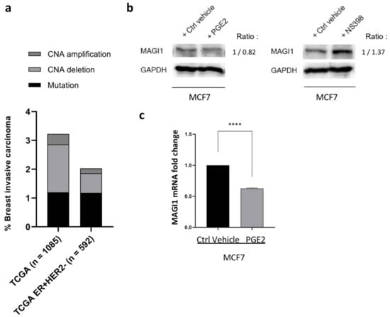 Considering its clinical relevance, one important emerging question concerns the mechanisms of downregulation of MAGI1 expression in ER+ BC. We interrogated the TCGA dataset to investigate whether MAGI1 expression could be influenced by DNA alterations. The results showed that MAGI1 mutations or copy number alterations (CNA) are rare as they are observed in less than 3% of all breast cancers, and 2% within ER+/HER2− BC (Figure 8a), indicating that DNA alterations are not the major cause of MAGI1 downregulation.