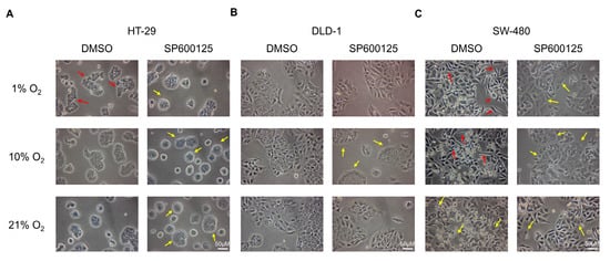 Cell morphological changes under different oxygen levels. HT-29 acquired more loosely packed colonies (red arrows) under 1% O2 conditions, while the presence of SP600125 (10 µM) changed the cell colony to be more rounded and more densely packed (yellow arrows) under all oxygen levels investigated (A) DLD-1 did not show prominent changes in cell morphology under different oxygen level incubation. Cell colonies became more closely packed in 10% O2 conditions (yellow arrows) in the presence of SP600125 (B) SW-480 showed more mesenchymal features at 1% and 10% O2 by having more spindle-shaped cells (red arrows). More epithelial cell colonies (yellow arrows) formed under different oxygen levels with SP600125 addition, especially in 1% and 10% O2 conditions (C). Sample images from 5 independent experiments performed (200× magnification).