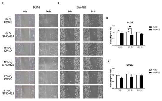 Wound healing assay under different oxygen levels. Wound healing assay showed that there were no significant differences of migration rate between different oxygen level incubation in DLD-1 (A,C) and SW-480 (B,D) cells. While the presence of JNK inhibitor SP600125 (10 µM) generally reduced the migration rate among different oxygen levels in both cell lines, with 10% O2 having significant reduction in DLD-1. The data (means ± SEM) were expressed as the relative migration rate against the rate under 21% O2 + DMSO (C,D). ** p < 0.01, DMSO versus SP600125. N = 3 (SW-480) and 4 (DLD-1).