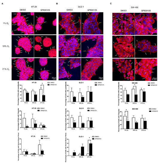 In SW-480, similar percentages of cells with lamellipodia and filopodia formations were recorded among different oxygen levels (Figure 3C). The presence of JNK inhibitor reduced formations of lamellipodia and filopodia. There was no observable ventral stress fiber formation in SW-480.