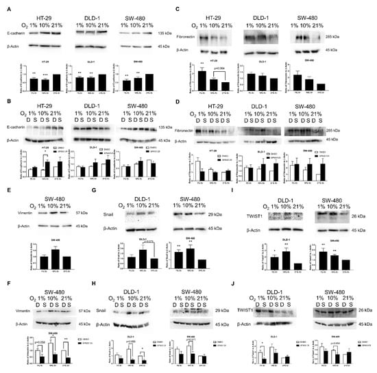 Epithelial–mesenchymal transition (EMT) marker and transcription factor expressions under different oxygen levels. EMT markers and transcription factors were evaluated by Western blotting in different oxygen levels on HT-29, DLD-1, and SW-480 cell lines. The key epithelial EMT marker E-cadherin was significantly down-regulated in all three studied cell lines in 1% and 10% O2 (A) JNK inhibitor SP600125 (10 μM) could generally up-regulate E-cadherin in different oxygen levels, especially for 10% O2 in HT-29 (p < 0.05) (B) The mesenchymal EMT marker fibronectin was generally up-regulated in lower oxygen levels with 1% O2 in HT-29 having significant up-regulation (C) HT-29 experienced down-regulation of fibronectin in the presence of SP600125, while DLD-1 and SW-480 had up-regulation of fibronectin in 10% and 21% O2 by SP600125 (D) Another mesenchymal EMT marker, vimentin, was only detectable in SW-480; it was mildly promoted in 10% O2 but not in 1% O2 (E) SP600125 could substantially reduce vimentin expression under different oxygen levels, especially for 10% and 21% O2 (F) EMT transcription factors Snail and TWIST1 expression levels in different oxygen levels were evaluated in DLD-1 and SW-480 (G–J) Substantial promotions of Snail in lower oxygen levels were found with SW-480 having significant increase in 1% and 10% O2 (G) Snail was generally suppressed by SP600125 with more prominent effects in DLD-1 (H) TWIST1 also had significant promotion in lower oxygen levels among SW-480 and DLD-1 (I) and it experienced a suppression effect by SP600125 in both 1% and 10% O2 (J) The data (means ± SEM) were expressed as the relative expression compared with 21% O2 group, N = 9 (HT-29 and DLD-1) or 10 (SW-480) (A,C,E,G,I) The data (means ± SEM) were expressed as the relative expression compared with 21% O2 + DMSO group. N = 9 (HT-29 and DLD-1) or 10 (SW-480) for DMSO group, N = 4 (HT-29) or 5 (DLD-1 and SW-480) for SP600125 group (B,D,F,H,J). * p < 0.05, ** p < 0.01, *** p < 0.001. D: DMSO (0.1%), S: SP600125 (10 μM).