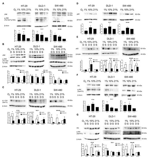 JNK and Akt pathway activation under different oxygen levels. The key markers of JNK pathways were evaluated by Western blotting. JNK was activated under lower oxygen levels in HT-29, DLD-1, and SW-480 with significant promotion in HT-29 and DLD-1 (A) There were generally mild reductions in JNK phosphorylation status by SP600125 (10 μM) in 1% and 10% O2 among the three cell lines, with greater effects on SW-480, while JNK phosphorylation was slightly promoted in 21% O2 (B) For the JNK direct downstream target c-Jun, its phosphorylation status p-c-Jun has been largely suppressed by SP600125 in lower oxygen levels, with significant reductions found in HT-29 and DLD-1 (C) The indirect downstream effector of JNK pathway p62 showed mild up-regulation in 10% O2 and down-regulation in 1% O2 (D) In the presence of SP600125, significant down-regulations were found in different oxygen levels among DLD-1 and SW-480 (E) However, for HT-29, significant up-regulation of p62 was evaluated in 10% O2. Akt, which is another important EMT promoter, also demonstrated an increase in activation under lower oxygen levels in the three cell lines, with SW-480 having significant activation (F) The 1% and 10% O2 activated Akt was abruptly inhibited by SP600125, particularly in HT-29 and SW-480 (G) The data (means ± SEM) were expressed as the relative expression compared with 21% O2 group, N = 9 (HT-29), 8–9 (DLD-1), or 10 (SW-480) (A,D,F). The data (means ± SEM) were expressed as the relative expression compared with 21% O2 + DMSO group. N = 4–9 (HT-29), 5–9 (DLD-1), or 5–10 (SW-480) for DMSO group; N = 4 (HT-29) or 5 (DLD-1 and SW-480) for SP600125 group (B,C,E,G). * p < 0.05, ** p < 0.01, *** p < 0.001. D: DMSO (0.1%), S: SP600125 (10 μM).