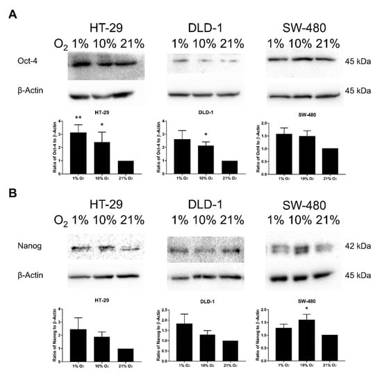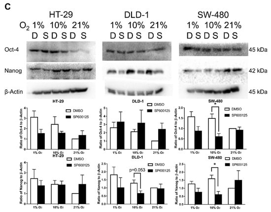Changes of SM markers of CSC, including Oct-4 and Nanog, in different oxygen levels were also studied. Results revealed general promotion of both markers in lower oxygen levels with greater promotion of Oct-4, especially for HT-29 and DLD-1 (Figure 6A,B). Significant up-regulations were found at Oct-4 in HT-29 (1% and 10% O2) and DLD-1 (10% O2) and Nanog in SW-480 (10% O2). For the study of the effect of JNK inhibition on Oct-4 and Nanog (Figure 6C), diverged results had been discovered in Oct-4 among the three cell lines. Oct-4 was generally suppressed by JNK inhibition among HT-29 and SW-480, while DLD-1 experienced slight up-regulation instead. In the meantime, Nanog was generally down-regulated by JNK inhibition among all three cell lines in 1% and 10% O2.